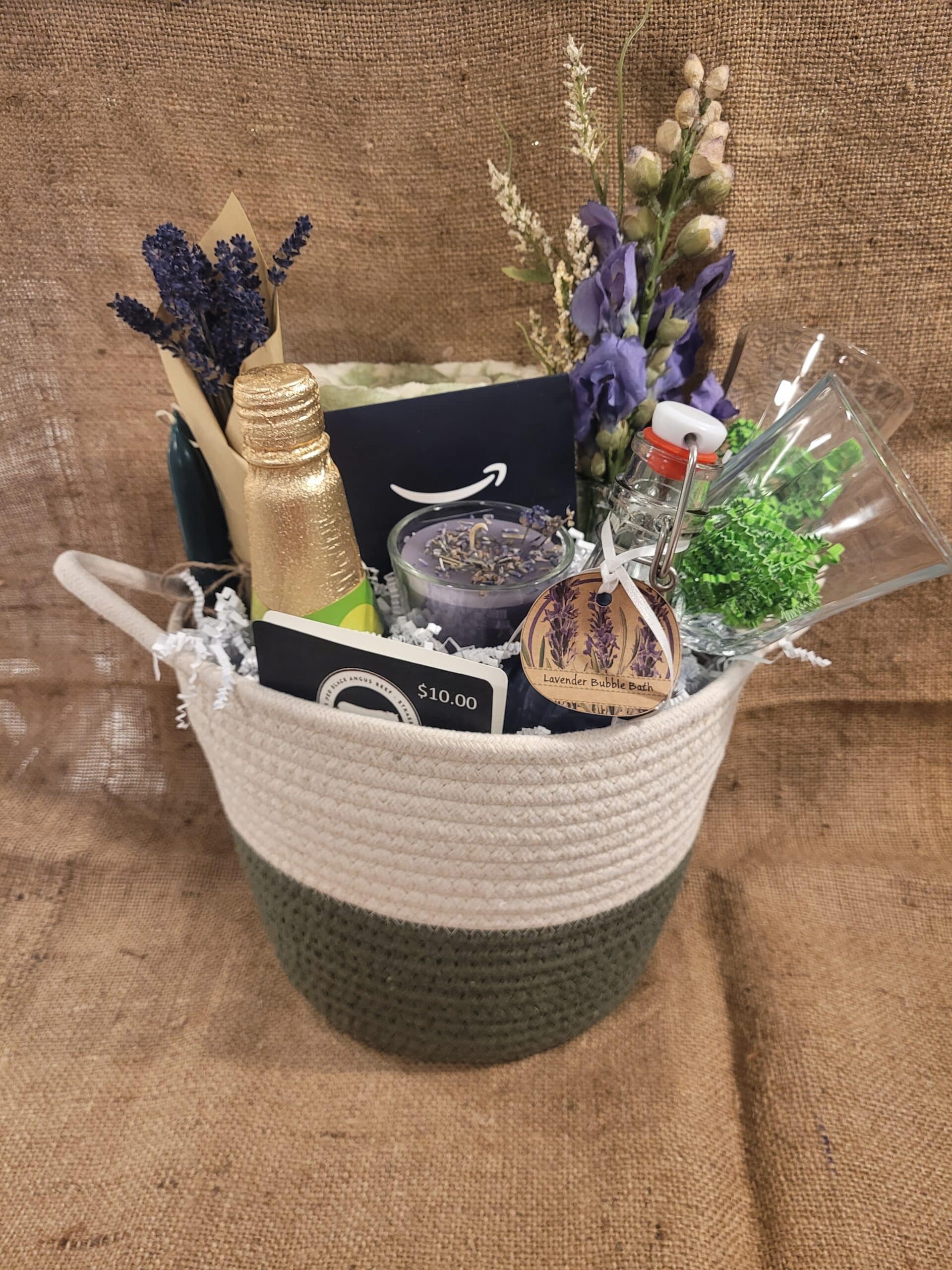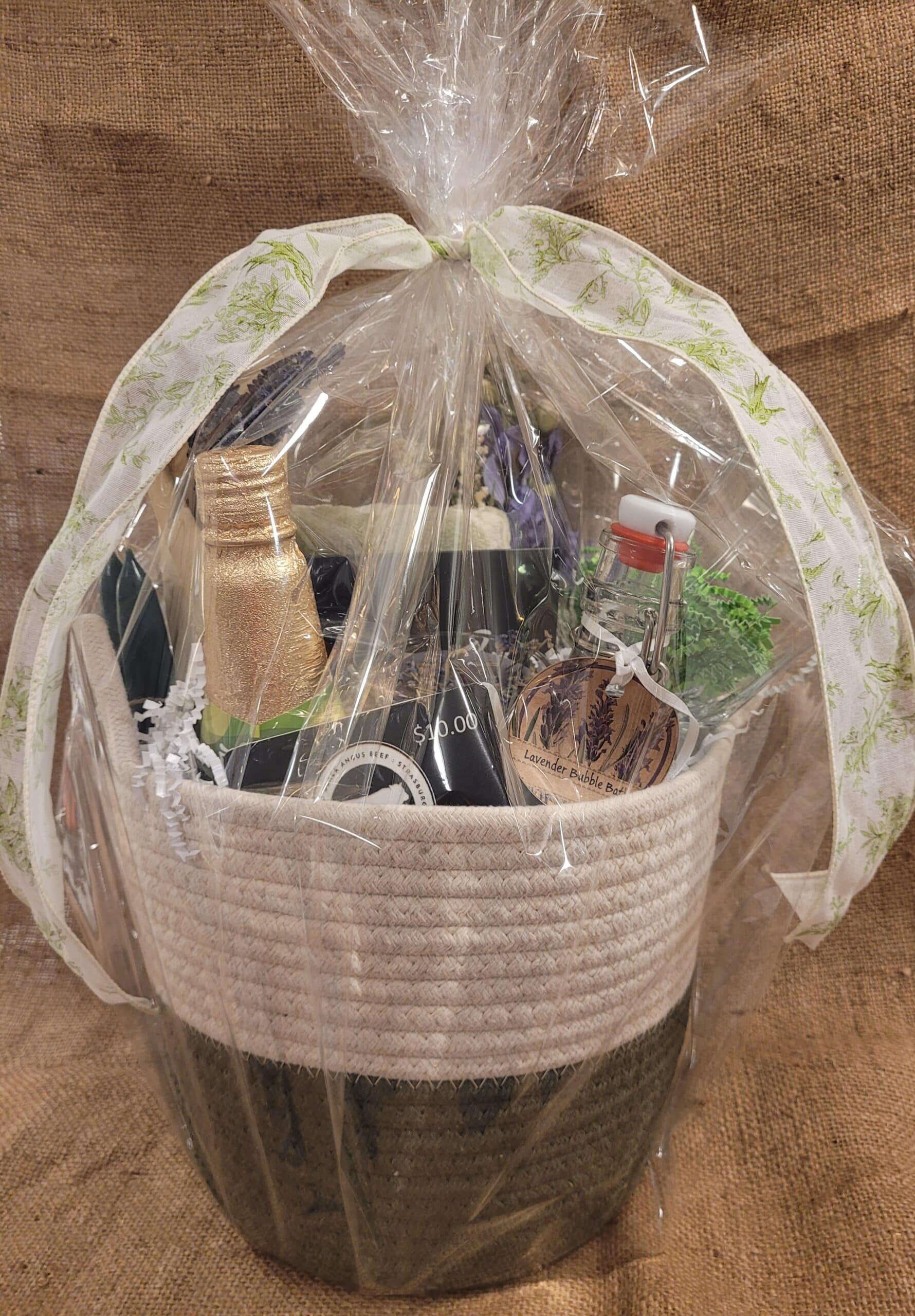 This one-of-a-kind gift comes in an off-white and green cloth basket and includes the following items: