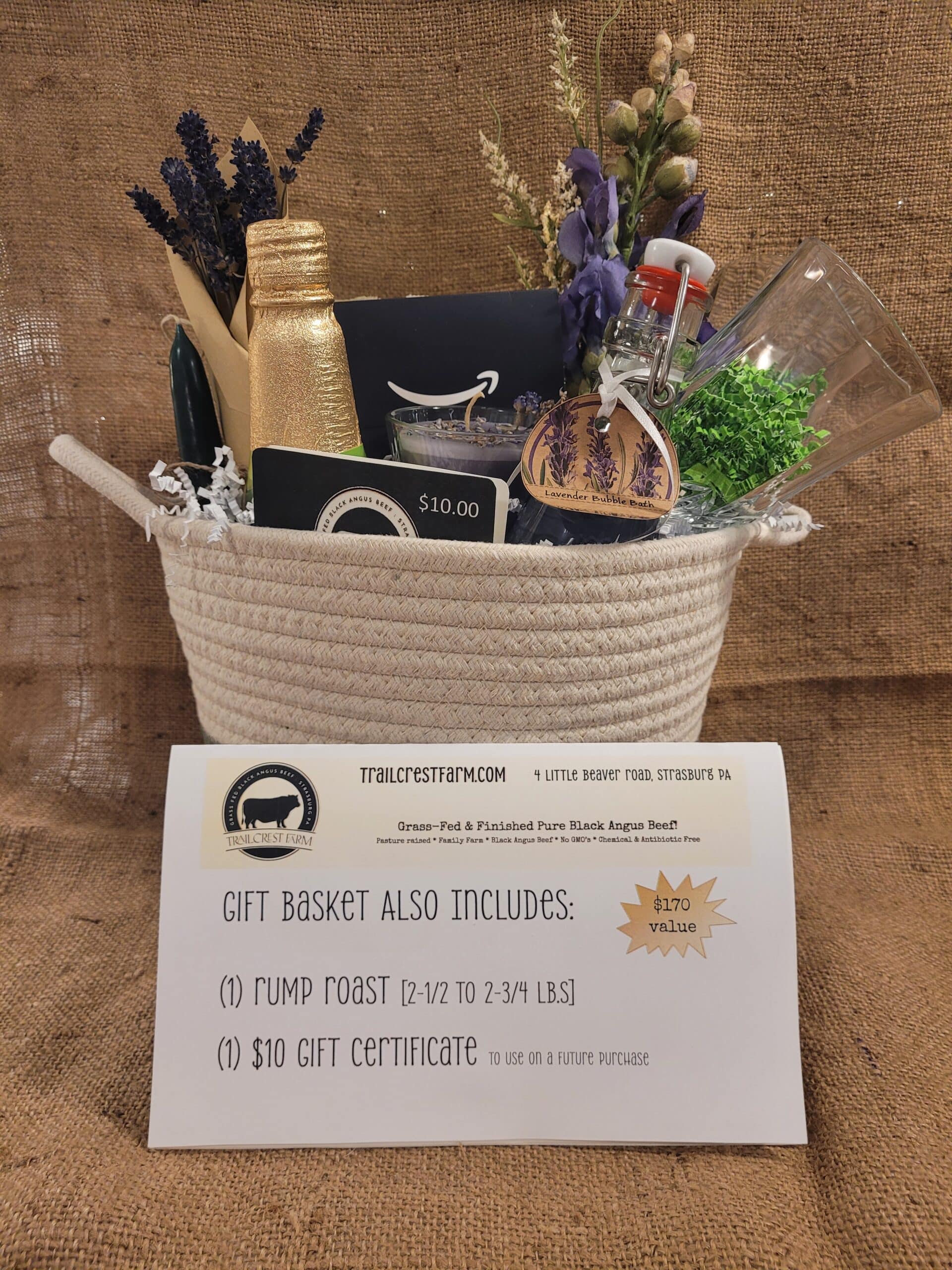 Let us help with your shopping! Trailcrest Farm’s SNUGGLES GIFT BASKET is perfect for every couple. Gift Basket comes wrapped in cellophane. Just add a gift tag! (Value: $169. See gallery photos for more detail.)