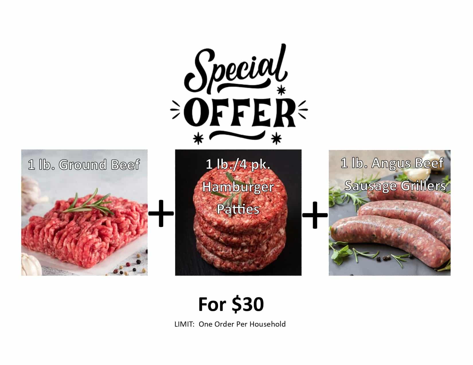 1 one pound package of our chemical free, antibiotic free, grass-fed and finished Black Angus ground beef PLUS 1 one pound package of our hamburgers/4 pack PLUS 1 one pound package of our NEW Beef Sausage Grillers (seasoned with mild italian seasoning.)