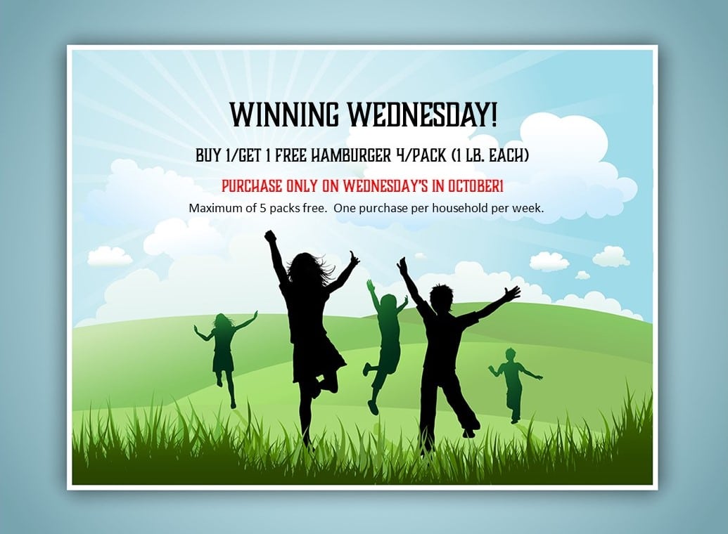 How to order: Place the number of packages of hamburgers you wish to buy in your cart and purchase on a Wednesday. We will automatically add one pack of free hamburgers to your order UP TO A TOTAL of 5 FREE PACKS/5 LBS free.
